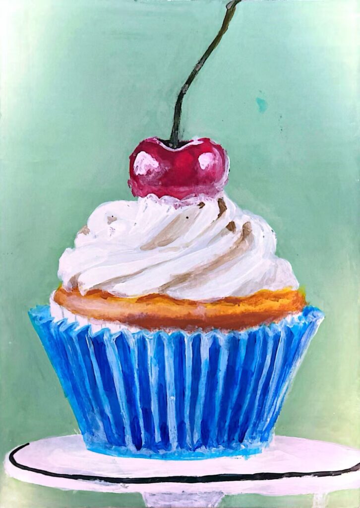Summary of work: Set against a soft mint-green background, the picture highlights a delicate cupcake: a bright blue paper liner wraps around a fluffy cake body, which is topped with voluminous and smooth white cream, and a bright red, plump cherry stands out as the “finishing touch”. The overall vibrant colors and lively brushstrokes vividly convey the freshness and sweetness of the dessert, as if one can feel the joy brought by a bite of that sweetness.