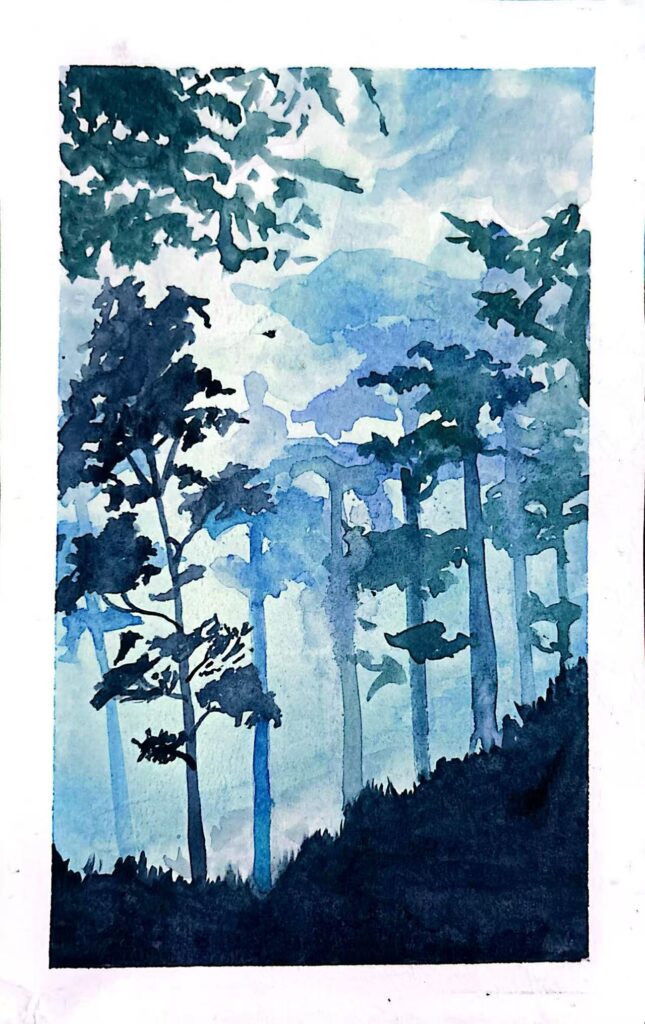 Summary of work: This watercolor painting primarily uses cool tones such as blue and cyan. With the technique of color blending, it depicts a forest scene shrouded in mist (or morning light). The outlines of the trees and the soft colors merge with each other, creating a tranquil and ethereal sense of a “secluded realm”. It seems to lead viewers into a forest secret place far from the hustle and bustle, conveying the hazy beauty of nature and a serene, quiet atmosphere.
