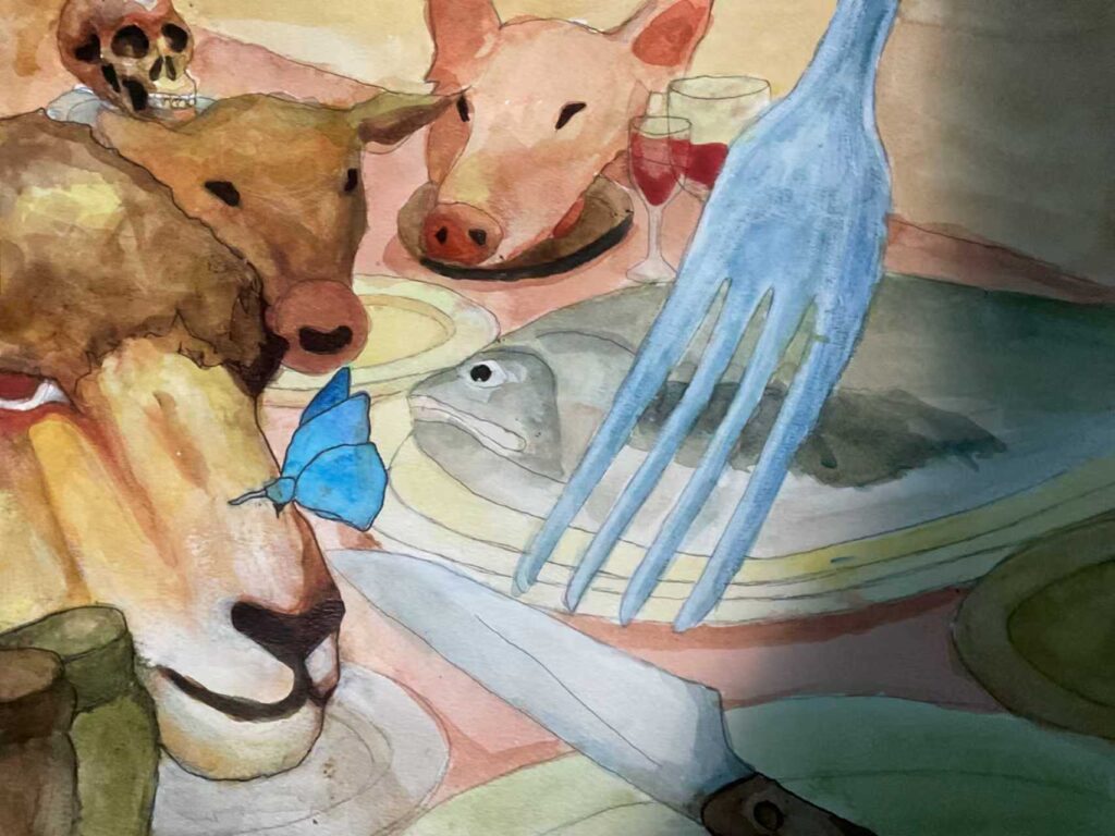 Summary of work:This watercolor painting creates a “dining table scene” full of metaphors: a fish lies on a plate, and the heads of animals like pigs and cows, even a skull (a symbol of the passing of life), are juxtaposed with the dining table, wine glasses, and a giant knife and fork (typical utensils for human dining). A blue butterfly rests on the head of a horse-like animal, adding a touch of lightness and poetic quality to the depiction of life.