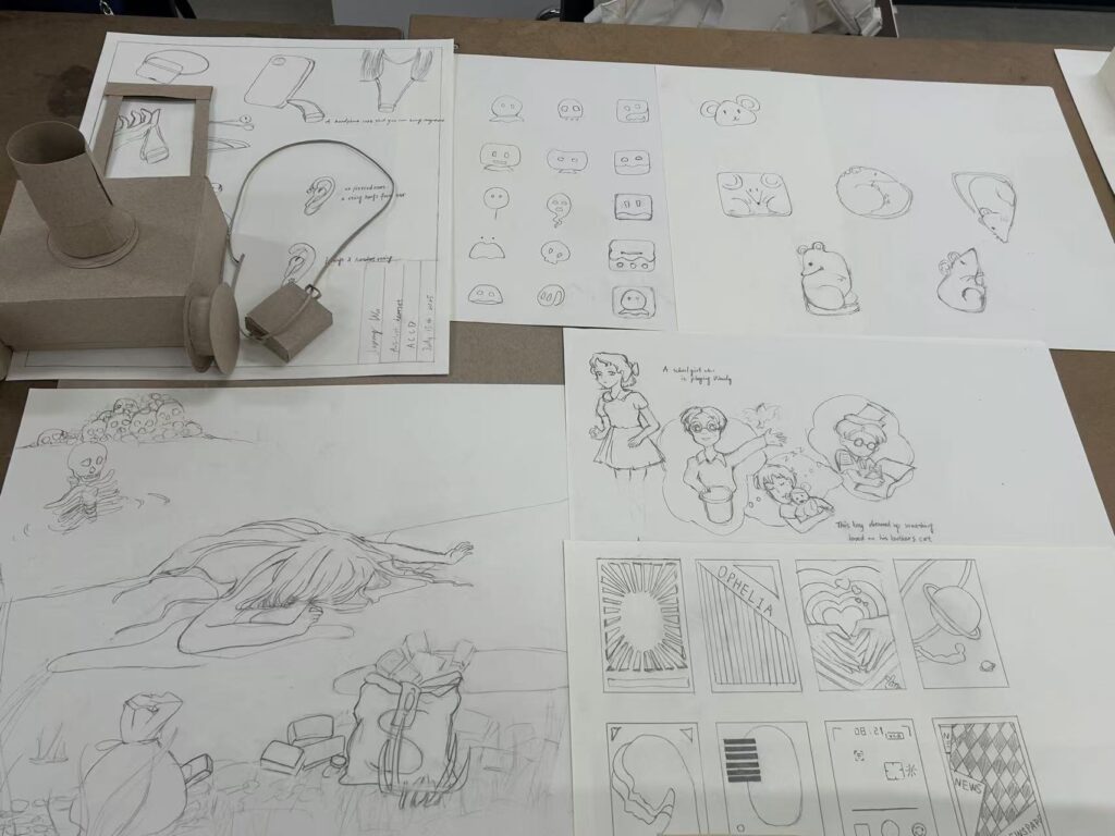 Summary of work: This black – and – white line drawing employs a metaphorical technique to depict a scene where a person’s head is entangled by snake – like, tentacle – like social elements (such as tags, like icons, and picture cards). These “tentacles” symbolize various symbols and interactive forms of social media platforms, tightly enclosing the person. It seems to reflect the current situation where people are entangled by the symbols and traffic logic of social networks, and it is hard for the self to break free from massive information and interactions, conveying reflections on the impact of social media on individuals.