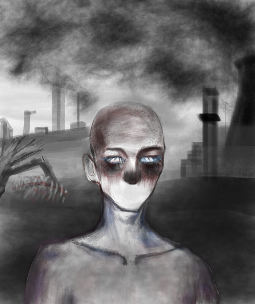 Summary of work: The picture uses black and gray as the main color tones. Thick smoke emitted from factory chimneys shrouds the sky, creating an oppressive atmosphere of industrial pollution. In the foreground, the figure looks haggard, and the color contrast on the face (such as the blue eyes and the dimmed facial areas) conveys the pain and decadence of life in a polluted environment. Overall, it metaphorizes the harm caused by industrial development to nature and human life, triggering reflections on environmental protection.