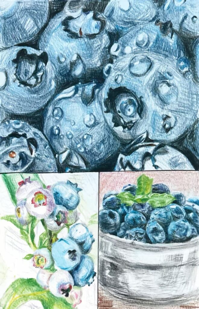 Summary of work: The picture is composed of three parts, all focusing on “blueberries”: The upper part is a close – up of blueberries with glistening water droplets, and the delicate brushstrokes show the plump and vivid texture of the fruits. The lower left part depicts branches with blueberries, where flowers and fruits coexist, overflowing with the vitality of natural growth. The lower right part shows a bucket filled with blueberries, which seems to be the harvest. Overall, through different scenes, it presents the process of blueberries from growing on branches to being harvested, conveying the beauty of nature’s gifts and the fresh charm of the fruits.