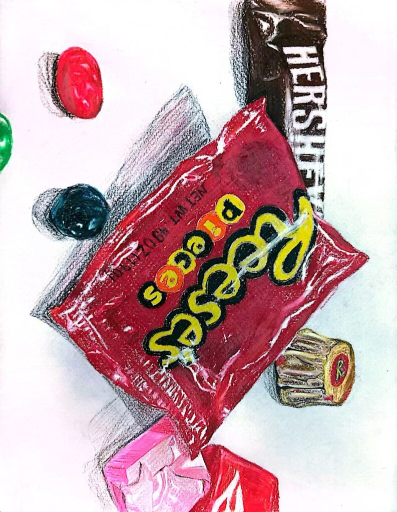 Summary of work: The picture presents a variety of candies with delicate brushstrokes: a Reese’s candy package with distinct brand logos, a Hershey’s chocolate bar, as well as colorful jelly beans and other uniquely – shaped small candies, which are scattered. With vivid colors and lifelike textures, it seems to spread out a “candy feast” full of sweetness and joy in front of people, conveying a rich sweet atmosphere and easily evoking beautiful associations with gustatory pleasure.
