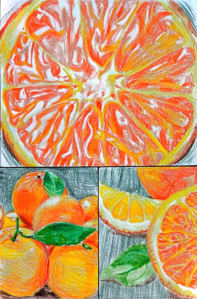 Summary of work: The picture is composed of three parts, showcasing the beauty and vitality of oranges from different perspectives: The upper part is a close – up of a sliced orange. Delicate brushstrokes clearly present the texture and bright color of the pulp, as if one can feel the fullness of the juice. The lower left part features whole oranges with green leaves; the fruits are plump and round, and the leaves are bright green, brimming with the vigorous vitality of natural growth. The lower right part is a combination of orange slices and leaves, with soft light and shadow, further emphasizing the fresh texture of the fruits. Overall, oranges are depicted from rich perspectives, conveying the vitality of the fruits and the beauty of nature’s gifts, just like a poem of vitality about “oranges”.