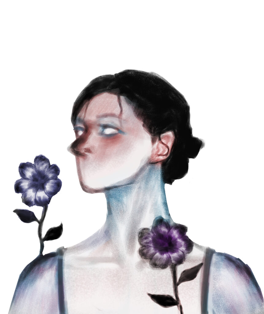 Summary of work: Set against a pure white background, the picture focuses on the poetic integration of the figure and purple flowers. The figure’s skin and neck are tinged with a soft blue hue, and two purple flowers seem to grow naturally from the side, forming a spiritual connection with the body. The overall atmosphere is quiet and ethereal, as if the flowers are an externalization of the soul. It not only conveys the spiritual sense of symbiosis between humans and the beauty of nature (plants) but also implicitly suggests the fusion of inner emotions and external poetry, creating a gentle surreal beauty.
