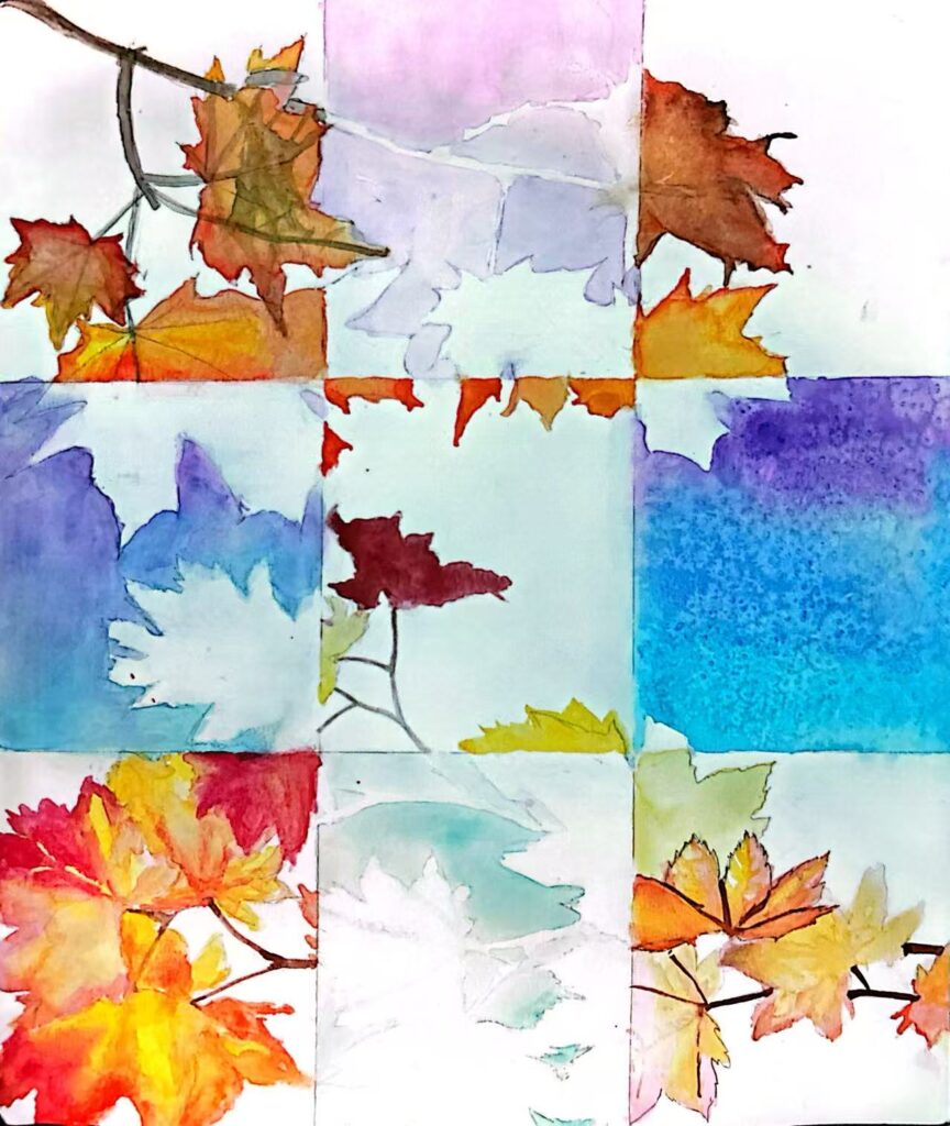 Summary of work: This watercolor painting adopts a collaged nine – grid composition to artistically split and reorganize the shapes and colors of autumn leaves. In different grids, autumn leaves like maple leaves exhibit brilliant autumn hues such as red, orange, yellow, and purple; some present clear leaf outlines, while others are diffused color blocks. It not only preserves the natural beauty of autumn leaves but also creates a creative atmosphere of “the language of leaves” through geometric division and color collision, as if recounting the diverse postures and poetic charm of autumn within the collage.