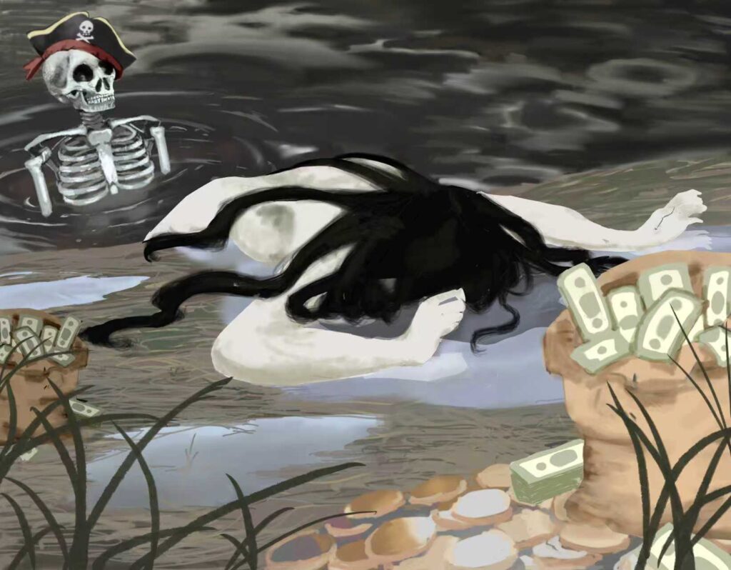Summary of work: Taking dark waters as the background, symbols of money like banknotes, coins, and money bags are scattered all over. A long-haired figure is sinking in the water, as if devoured by the temptation of money. Meanwhile, a skeleton wearing a pirate hat (symbolizing adventurers who met their ruin due to the pursuit of wealth) reinforces the metaphor that “excessive greed for profit will eventually lead to destruction” — Money is like a swamp: it lures people into sinking, yet also hides the crisis of disillusionment and demise, criticizing excessive desire for money.