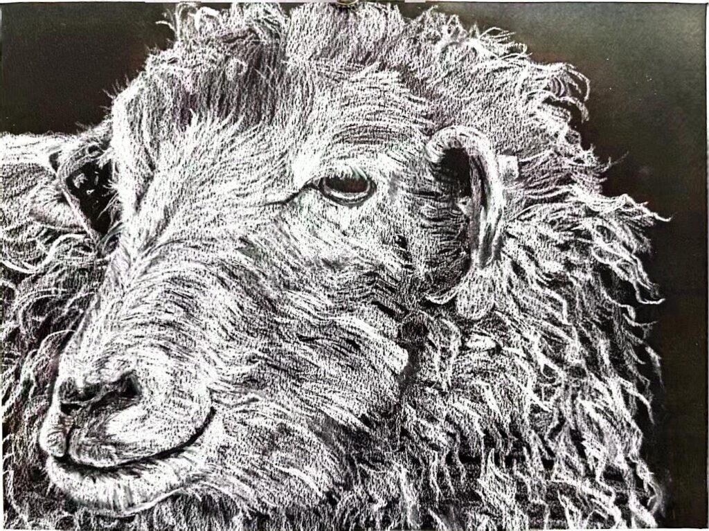 Summary of work: This work uses black – and – white contrast to delicately depict the fluffy wool and gentle demeanor of a sheep. The dark background highlights the subject, and through the precise use of lines and light – dark variations, it vividly presents the soft texture of the sheep’s wool. Overall, it conveys a tranquil and warm atmosphere, as if “wool” is used as a language to quietly tell the sheep’s peace and serenity.