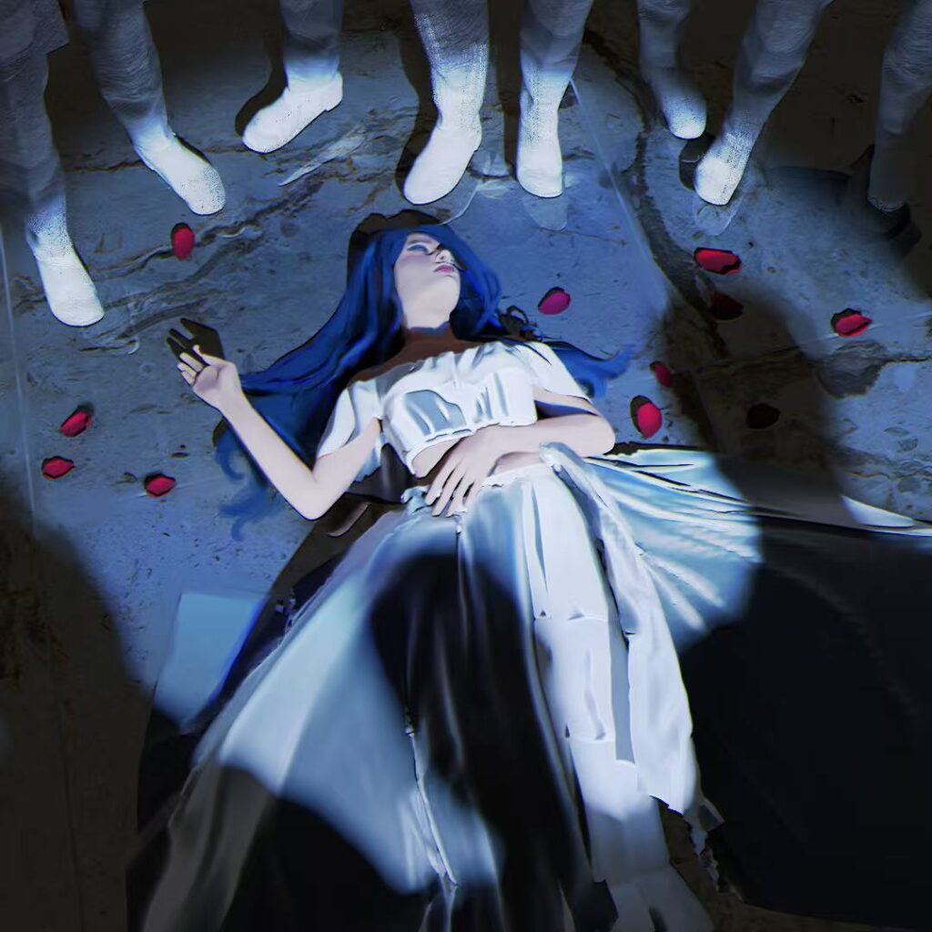 Summary of work:In the image, a figure with long blue hair lies on the ground wearing a plain white dress. Red rose petals are scattered around them, while several pairs of feet in white socks surround them, creating a sense of encircling “gaze”. Cool – toned light and shadow intertwine with soft elements (the fluffy blue hair, the flowing white dress, and the vivid roses), as if depicting a tragic “fall” moment. The color contrast between blue and red adds a dreamy and sorrowful atmosphere, seemingly conveying the complex emotional connection between the figure and the surrounding environment.