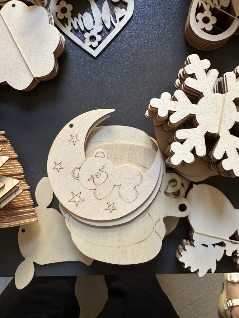 Summary of work: In the picture, unpainted wooden handicrafts are scattered. At the center is a crescent – shaped wood piece engraved with a little bear and stars, surrounded by wooden decorations like snowflake shapes. These handmade wooden artworks, with their natural textures, simple carvings, and the rustic feel of raw wood, create a pure and warm fairy – tale atmosphere. They seem like small handmade items prepared for childlike scenes or festivals, conveying the delicacy of handmade creation and the natural beauty of wood materials.