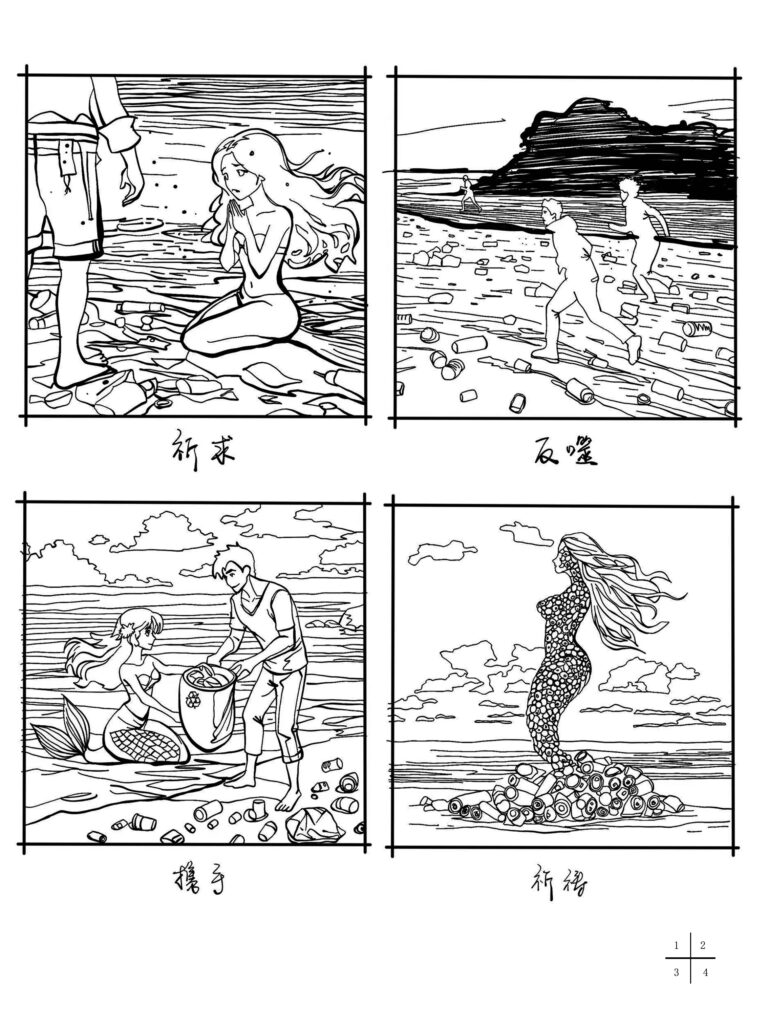 Summary of work: This is an environmental-themed comic focusing on marine plastic pollution: a beach littered with waste, where a mermaid curls up amidst the trash, displaying a pleading posture toward humans, vividly illustrating the survival struggles of marine life due to pollution. Yet, the consequences of pollution soon rebound on humanity—overwhelmed beaches become hazardous zones, forcing people to flee in panic. Realizing the issue, humans join forces with the mermaid to clean up the ocean trash, collaborating to mitigate their environmental harm. In the end, the trash is cleared, and the mermaid, now standing tall in a pristine environment, prays—echoing her initial plea while conveying the core message that “humans and nature must coexist and work together to protect the environment.”.